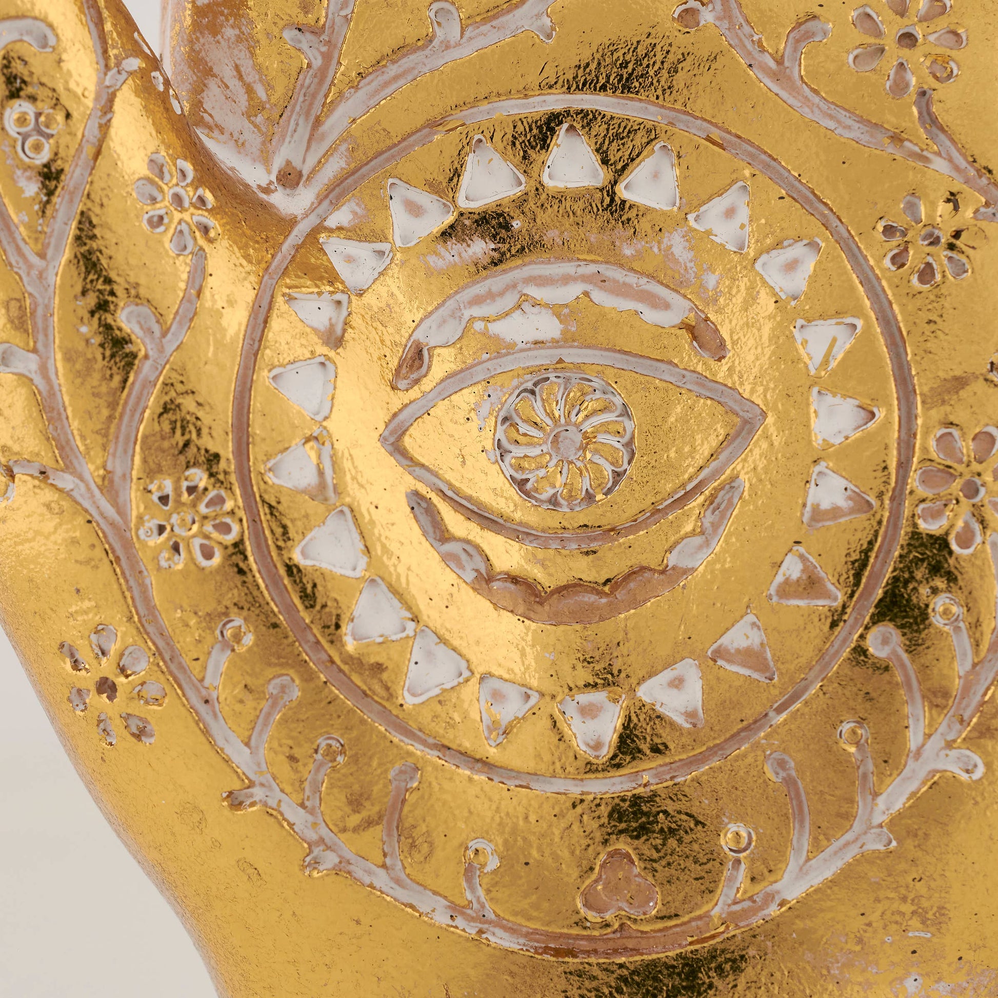 A decorative figurine displaying a Hamsa hand inspired design with metallic gold finish and sculpted floral patterns in white. Our Hamsa Hand figurine is designed to free-stand on any flat surface for display. A stylish home accent with a variety of display options.