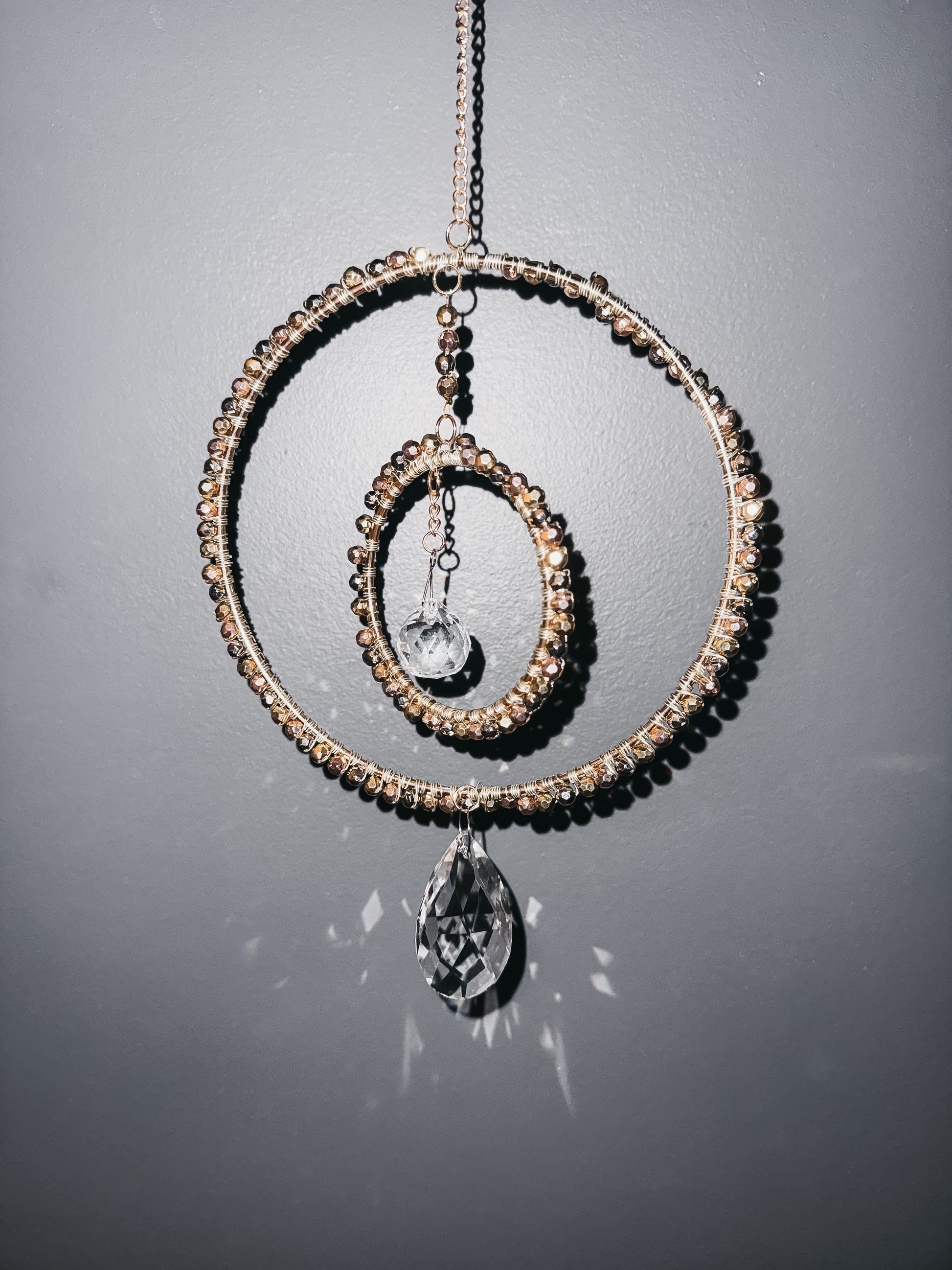 Adorned with silver, gold, and rose gold beads. This Suncatcher will definitely add a touch of sparkle to your room!